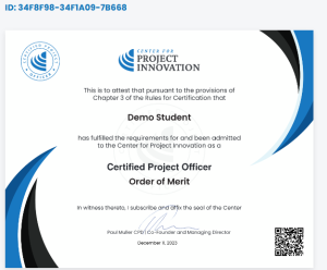 - Learners who successfully complete all the online quizzes with a passing grade of 80% are eligible to be admitted to the Center for Project Innovation as a Certified Project Officer (CPO). This Certification is a foundation level project management Certification that can be articulated into higher skills and experience-based Certifications.